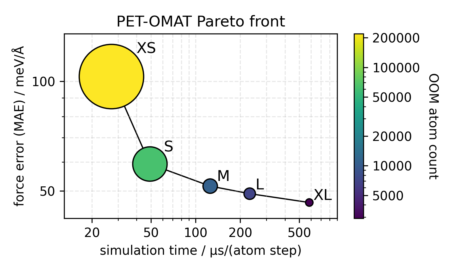 Larger sizes are more accurate but also more expensive and have a lower maximum system size before running out of GPU memory — see Fig. A2 in the reference above for the accuracy / cost / memory Pareto plot. As a rule of thumb, S is a good default for molecular dynamics, while L / XL are preferred for materials discovery workflows where accuracy dominates cost.