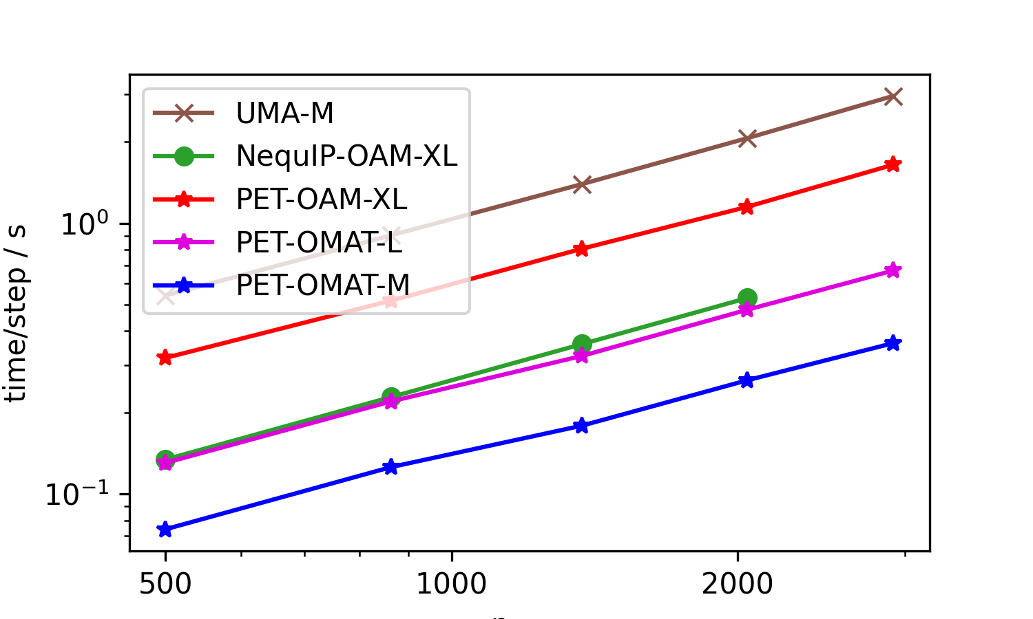 First, we present a benchmark of the top three open-source models on Matbench Discovery (as of Jan 14, 2026), replacing eSEN by its successor UMA-M. These were run on an H100 GPU (96GB VRAM). The structures are aluminum cells of increasing sizes and report time per energy/conservative force evaluation (lower is better). The NequIP model ran out of memory during the evaluation of the large structure (hence the missing point on the right).