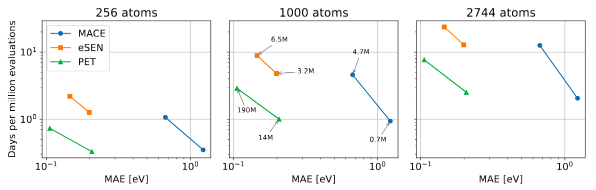 Besides the large PET-OAM-XL model, the figure also shows timings for two OMat24-trained models that are smaller (and faster). To get a sense of the speed-accuracy tradeoff, as well as the memory requirements of the entire PET-OMAT family, we also show a Pareto plot comparing cost and OMat24 validation errors